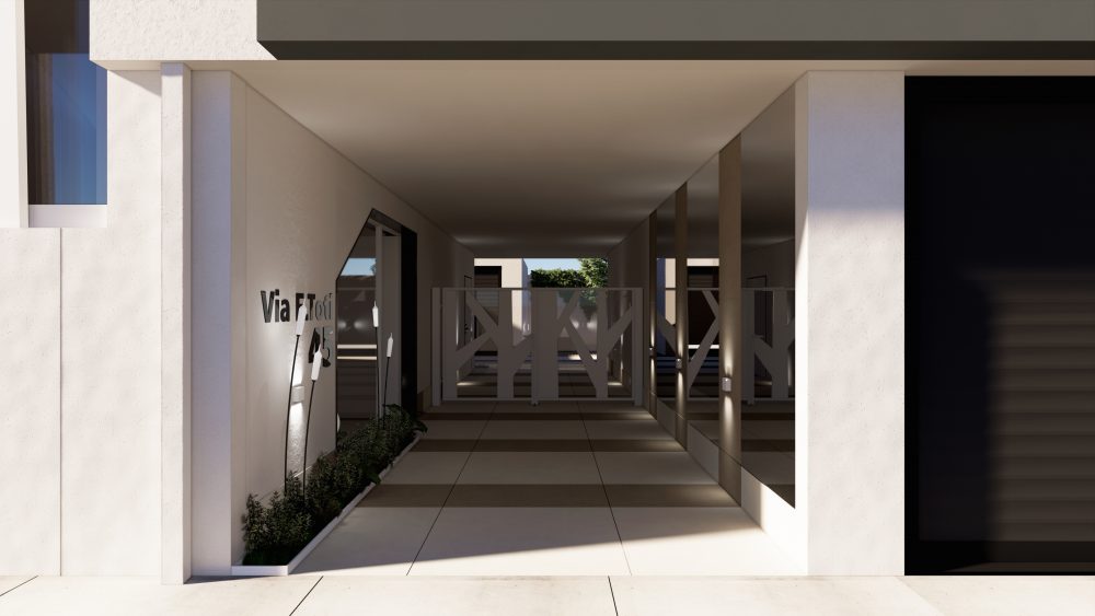 Disegno degli spazi comuni, androne di ingresso, passaggio carrabile.